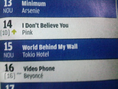 | на 15.10.09 USA #35|CherryTree Twitter Europa Germany| #1|Bravo Italy| #2 |FIMI Portugal| #2 |AFP Spain| #2 |Promusicae France| #3 |Charts in France Netherlands|#6|Dutch Charts Belgium(Flanders) |#6|Ultratop Belgium (Wallonia)|#9|Ultratop Austria| #8 |Austrian Charts Czech Republic| #8 |IFPICR.CZ Finland|#9|Finnish National Broadcasting Company Switzerland| #10 |Hit Parade Norway| #16 |Norweigian Charts