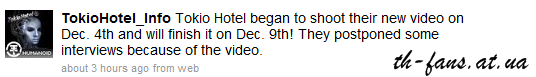 | Tokio Hotel приступили к сьемках своего нового видео (Lass uns Laufen/World Behind my Wall) 4 декабря, которые продлятся до 9 декабря. В связи со сьемками группа отложила несколько интервью для прессы.